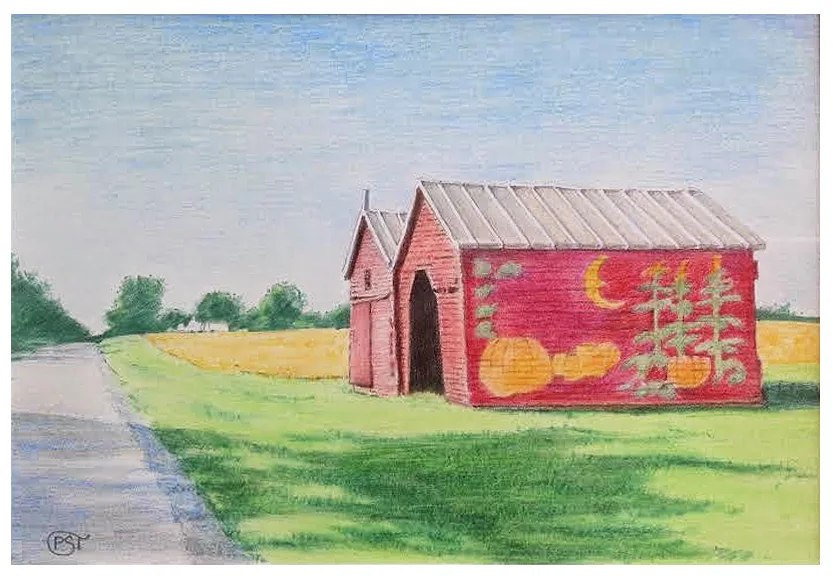 I pass these Red Barns every time I travel up route 11 towards Harrisonburg and every time I pass them, I say to myself or to the person in the car with me that I need to draw or paint them. They are so charming. I can imagine the person painting them. I imagine the pumpkins when first painted were more of a bright 'pumpkin ' color, but over the years it has faded to "peach".
