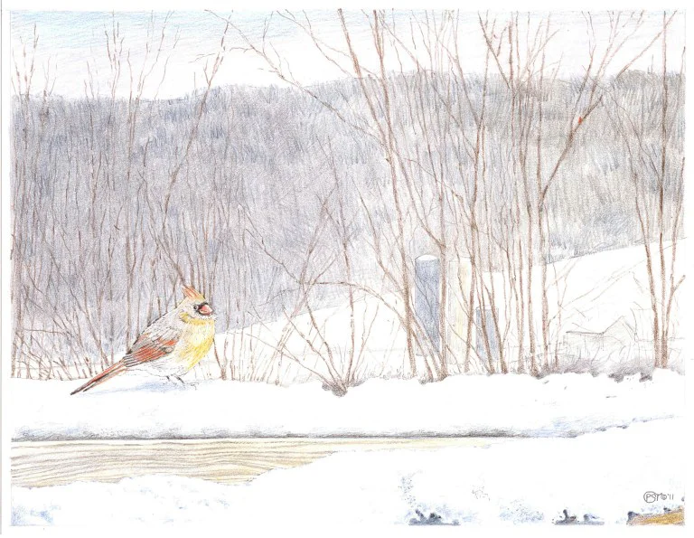 This bird was on my deck during the last snowfall and she looked so colorful next to the gray-blue background. If you look in the distant tree to the right you can see her mate, waiting and looking after her.
